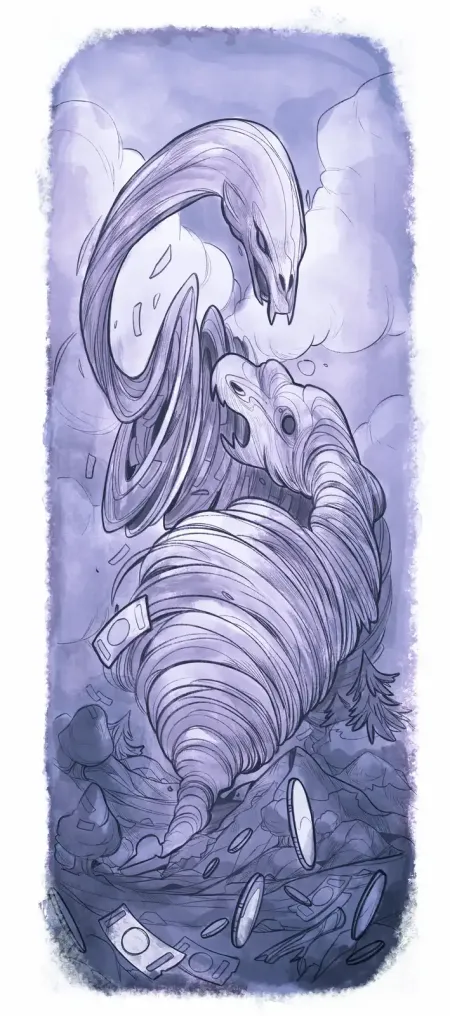 But before it could fully form and gather strength, it was attacked by the much larger money-whirlwind, which grabbed it in a greedy embrace and suffocated it, not allowing it to escape beyond the sphere. Firecurl went pale with fury.