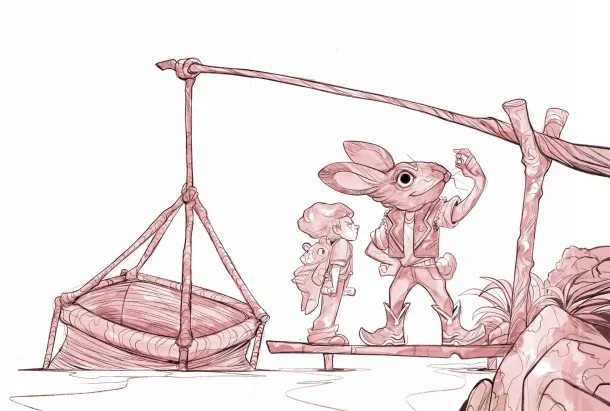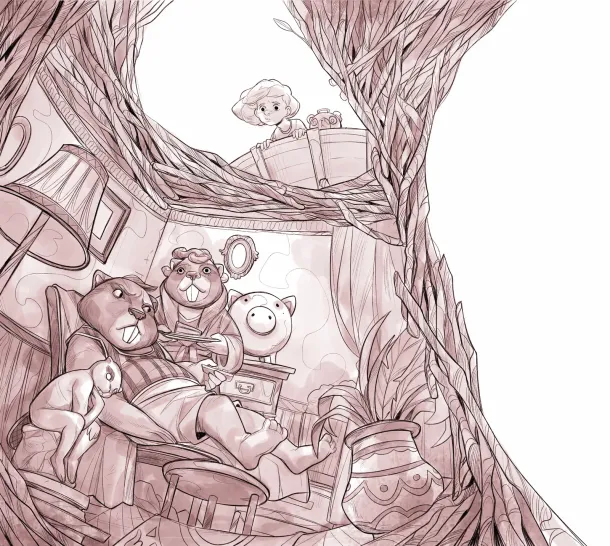 It was, in fact, a proper little house, built into the low branches of a thick tree. Woven from tough twigs and covered with bundles of straw, it looked quite cosy. A sturdy wooden ladder led up to a small veranda in front of the house, furnished with a table and a few chairs.