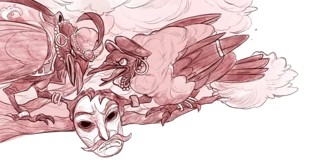 After a few more steps, a small meadow appeared before their eyes, with a single withered tree at its center. Perched in its branches were two magpies, each taller than Anne. Both were decked out from head to toe in earrings, rings, and necklaces — though at the moment, they looked rather disheveled.