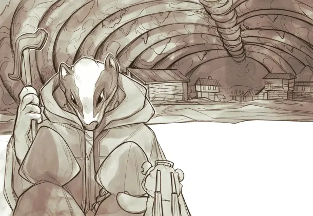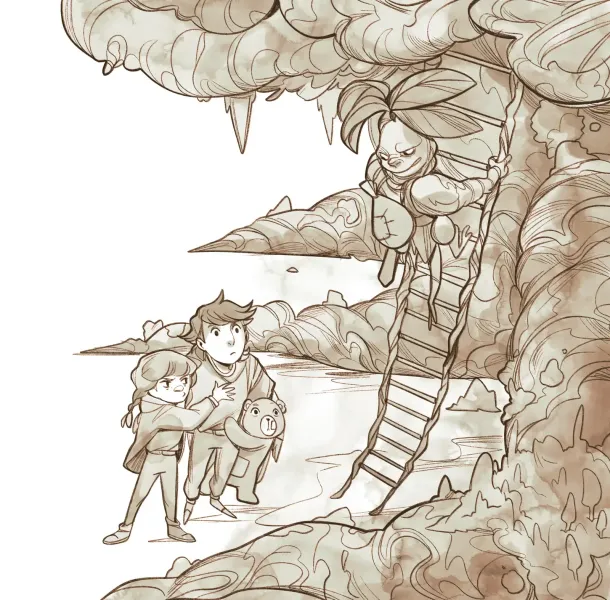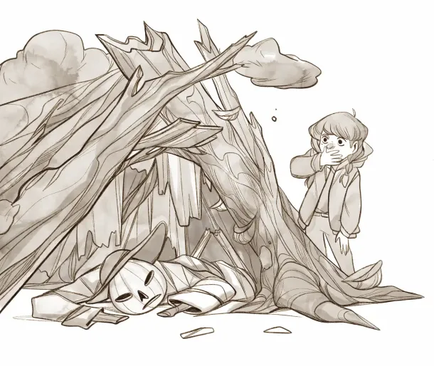 The hideout was dimly lit, and at first, Pouchy couldn’t make out a thing. But soon her eyes adjusted, and she saw that her friend was holding in her lap… a giant hollowed-out pumpkin, from which two snapped sticks protruded, tied together in a cross.