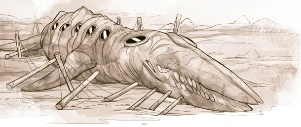 They had ended up in something that, at first glance, resembled the interior of a ship — at least that was the impression given by the enormous ribs rising straight from the ground and covered on the outside with some coarse material. How large the entire structure was couldn’t be said, as its outlines vanished far into the darkness.