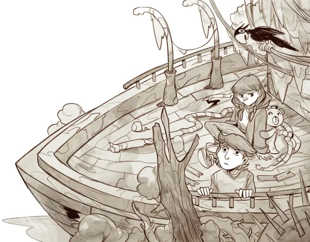 They were somewhere in the middle of the river, aboard an old, rusty, and firmly anchored steamboat. Nothing around them looked familiar. In fact, this part of the forest could hardly be called a forest anymore — it had completely changed its color, from green to red.