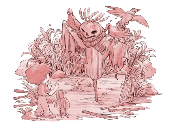 In the middle of the meadow, leaning to one side like the Tower of Pisa, stood a lonely scarecrow.