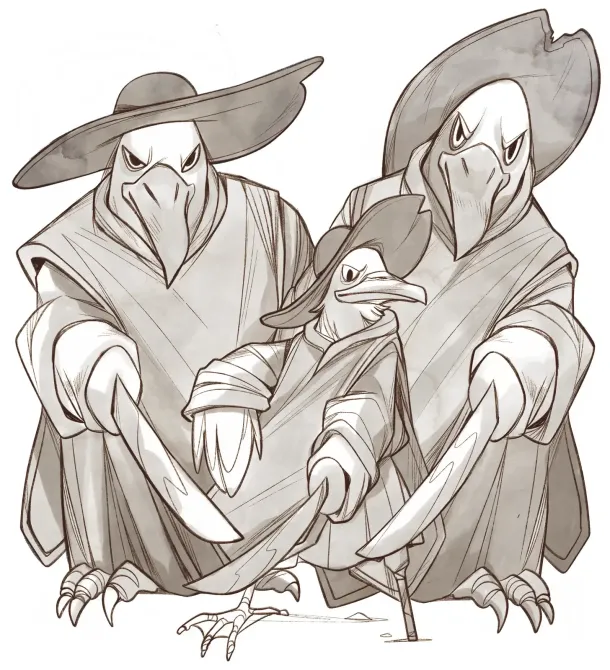 Before any of the travelers could blink, they suddenly found themselves surrounded by three tall figures, tightly wrapped in long cloaks, their faces hidden behind masks. In their hands, long metal blades gleamed dully.